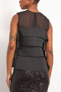 The Sacai Chiffon Mix Cotton Poplin Pullover in Black features a sleeveless design, sheer inset at the neck, and tiered full silhouette. This pullover features the classic Sacai layering technique. We love it worn with jeans and heels. - Fits true to size, take your normal size - Sheer inset on neckline - Tiered full silhouette - 65% polyester/35%cotton