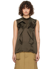 Paneled polyester chiffon and satin blouse. · Band collar · Ruffled trim at front · Zip closure at back Supplier color: Khaki 100% polyester. Made in Japan 251445F096020