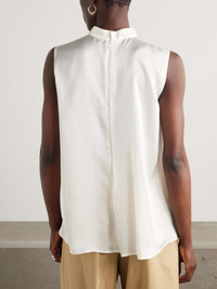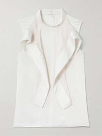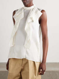 EDITORS'NOTES Innovative fabric combinations and unexpected silhouettes make Sacai's pieces feel so unique. Made from ivory chiffon, this blouse is trimmed with satin ruffles through the front to enhance its floaty shape. Complement the high neckline with chunky earrings. SIZE & FIT Model measurements: - Size 1 = XS, 2 = S, 3 = M, 4 = L - Fits true to size, take your normal size - Designed for a slightly loose fit - Lightweight, semi-sheer, non-stretchy fabric - Model is 177cm/ 5'10" and is wearing the designer's size 2 - Bust: 80cm/ 31.5" - Waist: 60cm/ 23.5" - Hip: 89cm/ 35" DETAILS & CARE - Ivory chiffon and satin - Concealed snap and zip fastening at back - 100% polyester - Dry clean
