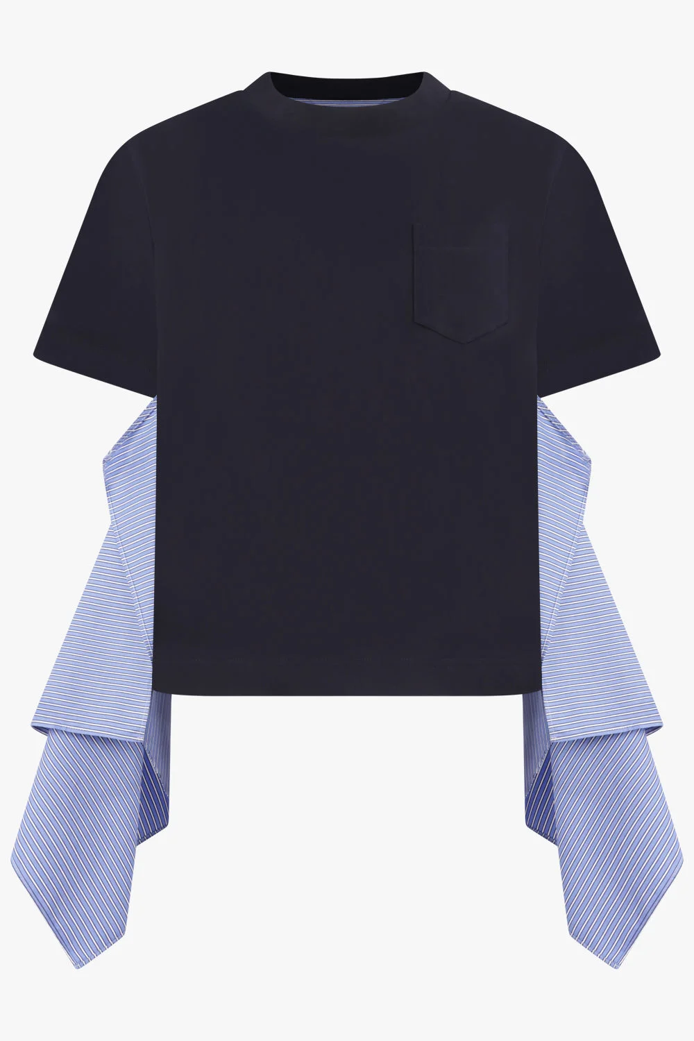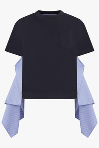 A modern wardrobe essential, the S/S T-Shirt With Side Shirting Panel in Navy/Blue captures the brand’s artful blend of casual ease and conceptual layering. Crafted from soft cotton jersey with a contrasting side shirting panel, this T-shirt introduces subtle deconstructed detailing that elevates a classic silhouette. The navy and blue tones provide versatility, while the relaxed fit ensures effortless wearability. - Fabrication: Cotton jersey with cotton shirting panel - Soft, breathable cotton jersey construction for comfort - Contrasting side panel in lightweight shirting fabric for layered effect - Relaxed fit that drapes naturally across the body - Classic crew neckline with modern, asymmetric detailing - Navy/blue colourway for versatile, contemporary styling Style it with tailored trousers or denim for a polished casual look. Size and Fit Tiah: Model is 178cm/5’9” and is wearing a size JP1 Model Measurements: Bust: 86cm, Waist: 69cm, Hips 90.5cm Fits true to size Measurements Size 1: Bust 96cm, Waist 96cm, Hip 96cm, Length 66cm Size 2: Bust 102cm, Waist 102cm, Hip 102cm, Length 66cm Size 3: Bust 104cm, Waist 104cm, Hip 104cm, Length 66cm Size 4: Bust 112cm, Waist 112cm, Hip 112cm, Length 66cm