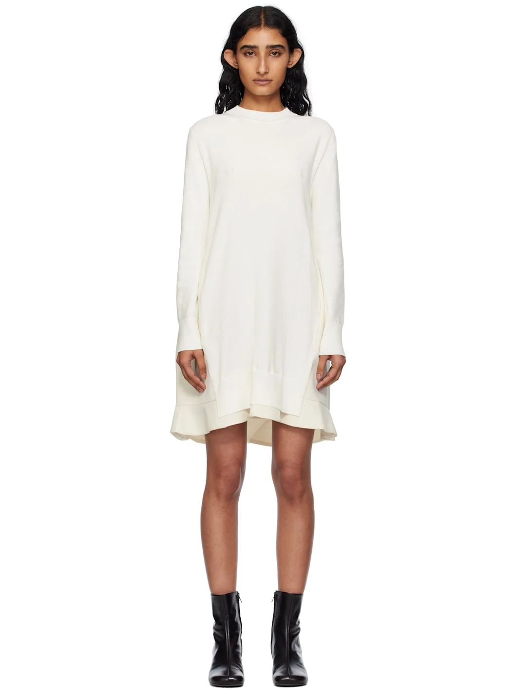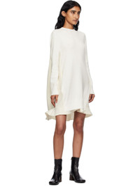 Knit cotton-blend and wool-blend bonded jersey minidress. · Paneled construction · Rib-knit crewneck, hem, and cuffs · Seam pockets at waist · Subtle flared hem · Knife and box pleats at back yoke · Partial cupro satin lining Supplier color: Off white Body 1: 57% cotton, 43% polyester. Body 2: 70% polyester, 30% wool. Trim: 100% polyester. Lining: 100% cupro. Made in Japan 252445F052008