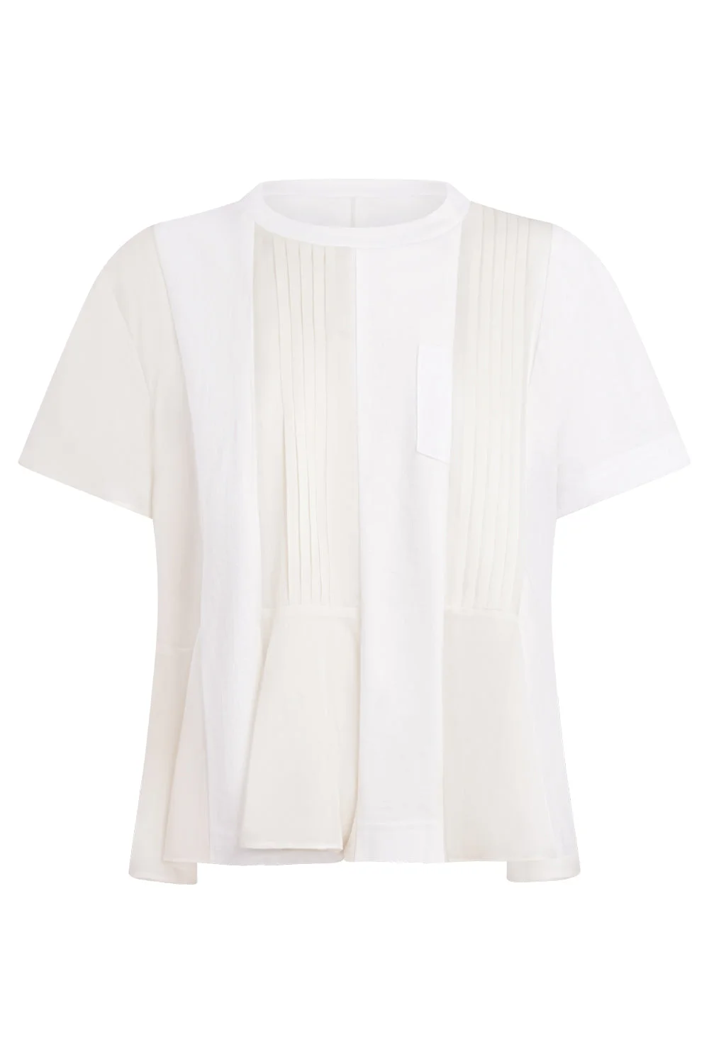 Showcasing Sacai’s signature hybrid aesthetic, this T-shirt combines classic cotton jersey with contrasting satin panel detailing. The layered construction introduces depth and movement while maintaining a relaxed, wearable silhouette. The soft off white tone enhances the clean lines of the design. Fabrication: Main: 100% Cotton Attached Parts: 100% Polyester Relaxed T-shirt silhouette Contrast satin panel construction Short sleeve design Soft cotton jersey fabrication Off white colourway A contemporary wardrobe essential designed to complement Sacai’s sculptural tailoring and layered styling. Measurements 1: Bust 80cm, Waist 80cm, Hip 80cm, Length 58cm 2: Bust 84cm, Waist 84cm, Hip 84cm, Length 58cm 3: Bust 86cm, Waist 86cm, Hip 86cm, Length 58cm 4: Bust 90cm, Waist 90cm, Hip 90cm, Length 58cm