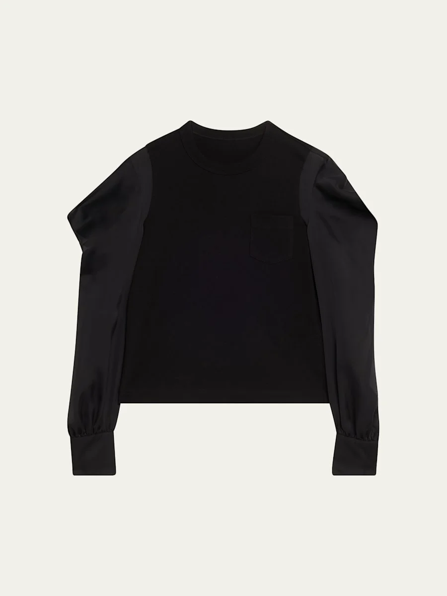 Crafted from cotton jersey, this Tshirt from SACAI features lustrous satin sleeves adorned with ruffles on the shoulders Crew neckline Long sleeves; button cuffs Relaxed fit Hip length Pullover style Cotton/polyester Dry clean Made in Japan SIZE amp; FITModel measurements: 5'10" tall Model is wearing a US size 4/Small