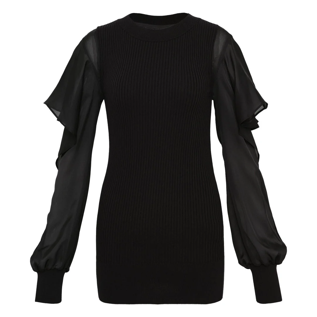 600078431BLK001 / 26-08336/00/001 - Ribbed cotton knit body construction - Sheer satin balloon sleeves - Crew neckline - Ruffled sleeve detailing - Fitted ribbed cuffs - Mixed-material hybrid design - Regular fit through body The sacai Satin x Cotton Knit Pullover delivers hybrid luxury through the brand's signature mixed-material approach. Crafted with ribbed cotton knit construction enhanced by dramatic sheer satin sleeves, creating an unexpected interplay of textures and proportions. The innovative sleeve detailing and contemporary silhouette showcase sacai's mastery of deconstructed Japanese design.