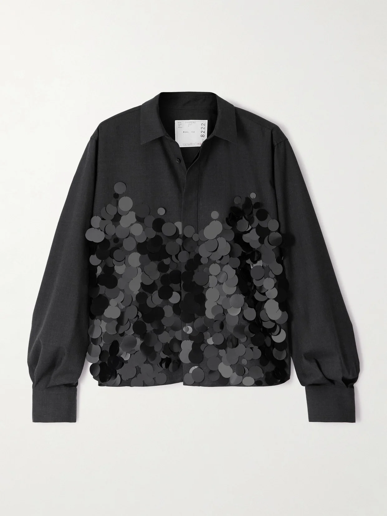 Sacai's shirt is tailored in Japan from wool and embellished with light-catching sequins arranged to mimic the shape of a sweetheart bodice. Finished with a pointed collar, it makes a striking party piece - especially styled with an equally statement bag.