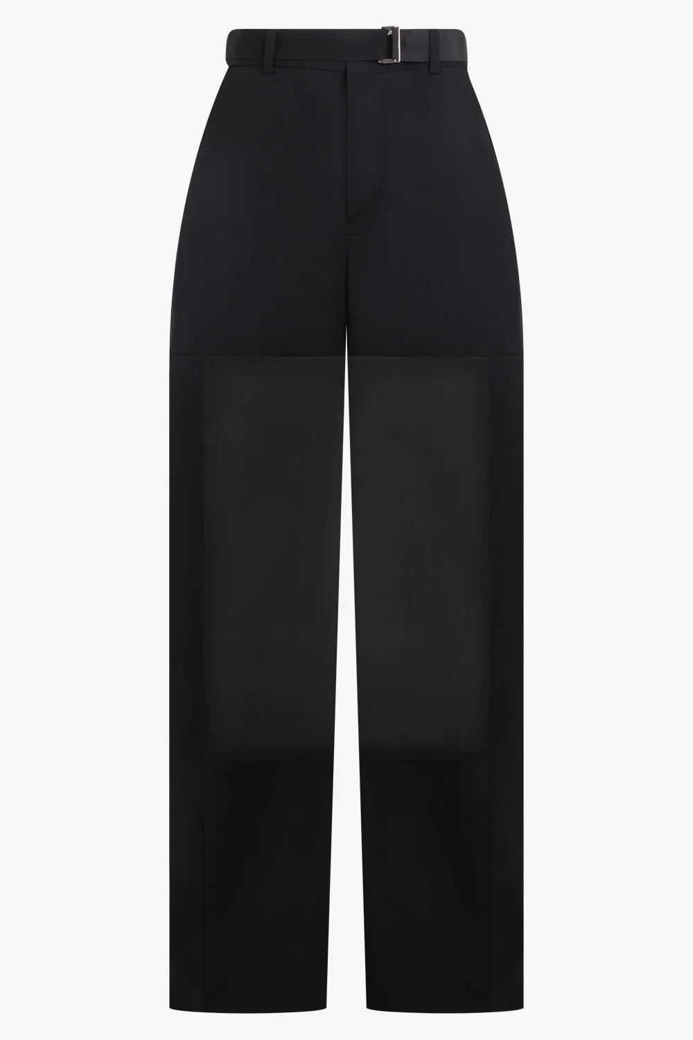 A signature exploration of hybrid tailoring, these Sacai pants combine structured suiting with contrasting sheer panel detailing. The wide-leg silhouette is softened by lightweight inserts that introduce movement and layered dimension. Balancing classic tailoring with Sacai’s experimental design language, the style offers a modern reinterpretation of formal dressing. Fabrication: Main: 100% Wool Attached Parts: 100% Polyester Lining: 100% Cupro Wide-leg tailored silhouette Sheer panel detailing through the leg Hybrid layered construction Structured waistband Black colourway Designed to pair with Sacai’s architectural outerwear or minimalist separates for a modern tailored look. Measurements 2: Waist 76cm, Hip 100cm, Length 112cm 3: Waist 80cm, Hip 104cm, Length 112cm 4: Waist 84cm, Hip 108cm, Length 112cm