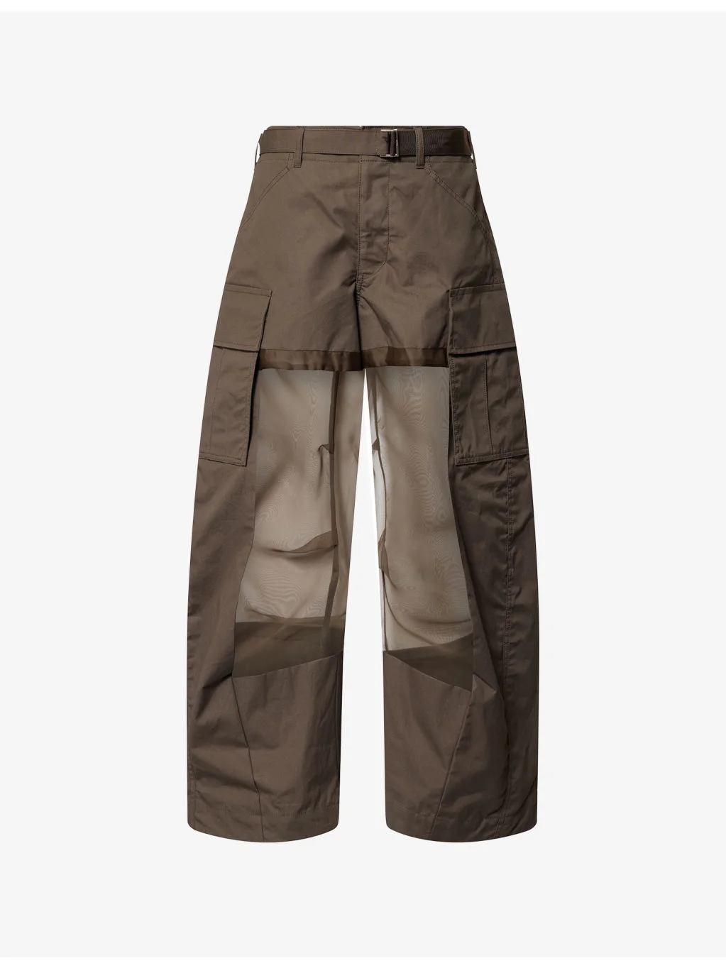 PRODUCT DETAILS - Sacai cotton trousers - 100% cotton; contrast 100% polyester; lining 100% cupro - Button and zip-fly fastening - Regular fit, wide leg, mid-rise, adjustable belt at waist, belt loops, slip pockets at front, flap patch pockets at sides, sheer panelling at inside leg, curve tapered ankle - Dry clean - Made in Japan - True to size - Size small: rise 12in / 30.5cm, inside leg 29in / 73.5cm, leg opening 24in /61cm - Model is 5ft 10in/1.78m and wears a size small - Midweight, non-stretch Ref: R04610037