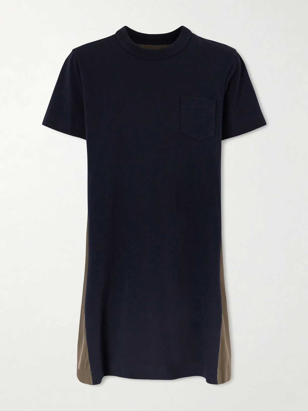 Sacai reinterprets everyday shapes with creativity and unexpected detail. This mini dress is crafted from cotton-blend jersey with shell panels at the sides for texture and dimension.