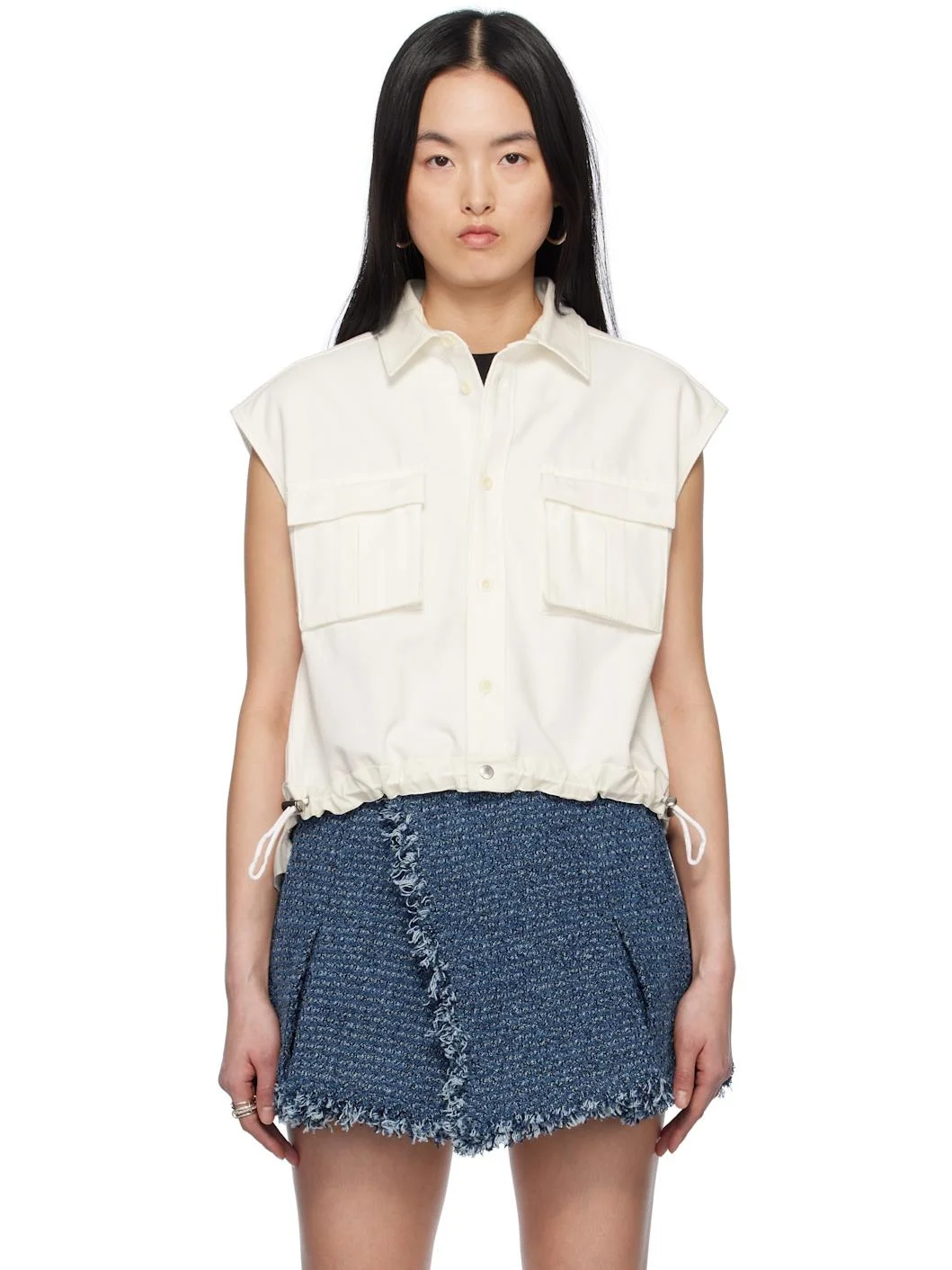 Paneled non-stretch denim and sheer polyester chiffon shirt. · Spread collar · Button closure · Bellows pockets at chest · Bungee-style drawstrings at tennis-tail hem · Pleats at back yoke · Logo-engraved silver-tone and off-white hardware Supplier color: Off-White Body: 100% cotton. Body 2: 100% polyester. Made in Japan 251445F109002