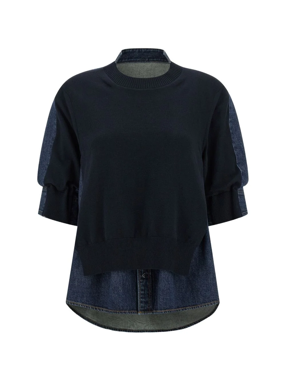shirt-style top Highlights - Blue - Shirt-style back - Contrast stitching - Crew neck - Short puff sleeves - Dropped shoulder Imported Composition Cotton 57%, Polyester 43% Washing instructions Read Manufacturer Guidelines