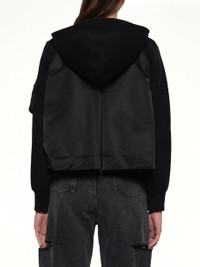 Sacai's Sponge Sweat x Nylon Twill Hoodie in Black is a unique blend of comfort and style, perfect for modern wardrobes. This hoodie combines innovative design with practical features for everyday wear. - Composition: Cotton 62%, Polyester 38%, Attached Parts:Nylon 100%, Liner:Polyester 100% - Features a relaxed fit for ultimate comfort. - Contrasting textures with sponge sweat and nylon twill. - Adjustable drawstring hood for a customizable fit. - Front kangaroo pocket for convenient storage. - Ribbed cuffs and hem for a snug finish. - Made in - Model is 178 cm and wears size 1 SKU: 2508173 002