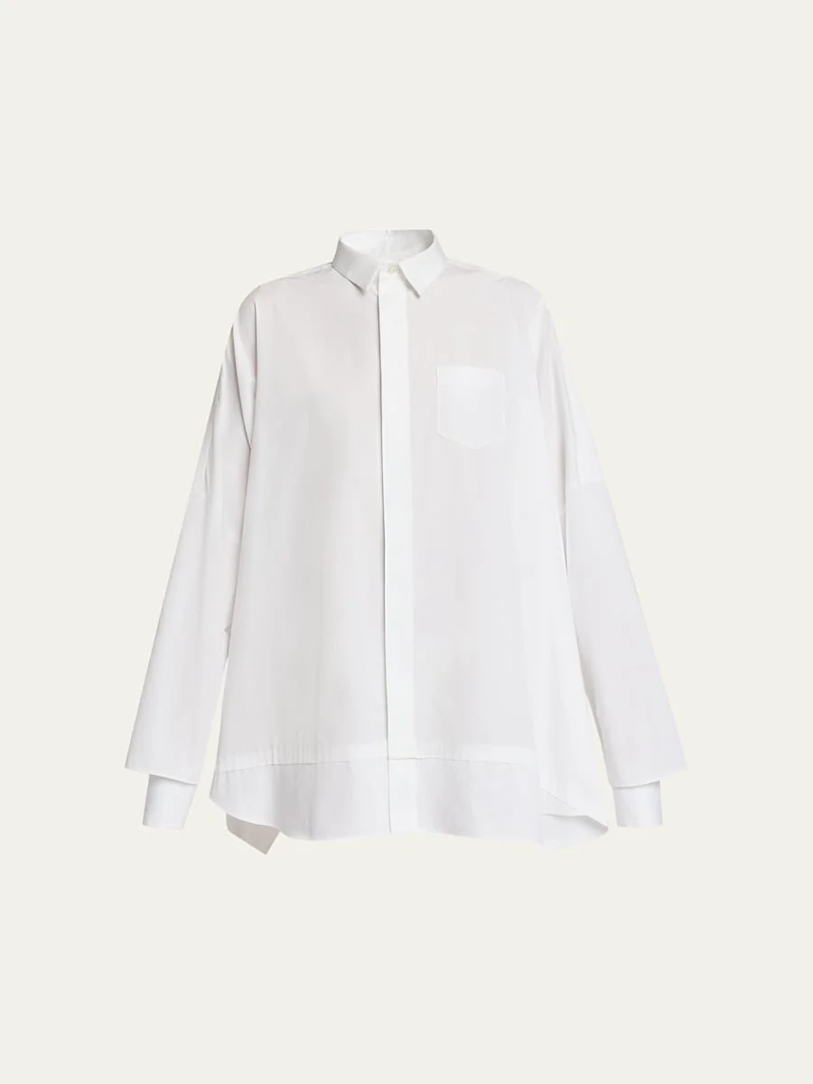 Crafted from crisp cotton poplin, this shirt from SACAI features a striped print and contrast hem panels creating a layered effect Point collar; concealed button front Long sleeves; button cuffs Drop shoulders Yoked back; box pleat Chest patch pocket Oversized fit Hem falls below the hip Handkerchief hem Polyester/cotton Dry clean Made in Japan