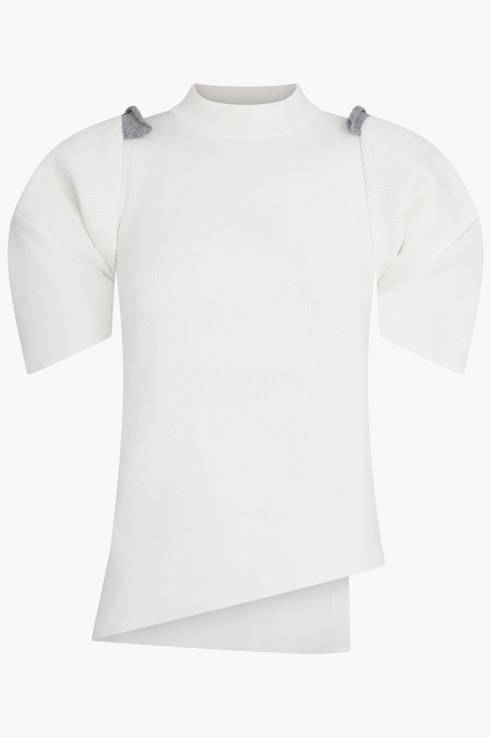 Architectural yet effortless, the Structured Shoulder Short Sleeve Asymmetric Knit Pullover in off-white reimagines knitwear with sculptural appeal. Crafted from 100% polyester with wool-blend attached panels, this piece features a chain-knit texture and bold, structured shoulders. The asymmetric hemline introduces dynamic movement, while the 3/4 length sleeves balance volume with refinement. Subtle panel detailing adds a layered depth, making it a directional staple for modern wardrobes. - Main Fabrication: 100% Polyester - Attached Parts: 80% Wool, 20% Nylon - Structured shoulders for sculptural shape - Chain-knit texture with visual dimension - Asymmetric hemline for a contemporary silhouette - 3/4 length sleeves - Off-white hue for versatile styling Pair with tailored trousers or midi skirts to create a striking, balanced look.