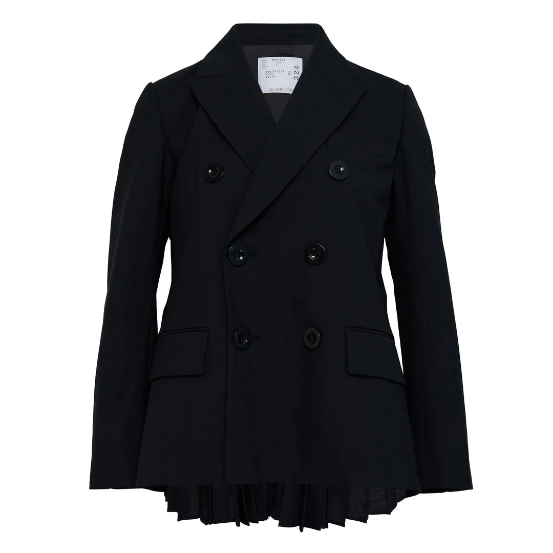 The sacai Suiting Jacket delivers contemporary tailoring with the brand's signature deconstructed aesthetic and innovative design approach. Crafted from premium wool suiting fabric in classic navy, featuring double-breasted construction with contrast pleated hem detail. The architectural silhouette and unexpected fabric combinations showcase sacai's mastery of hybrid garment construction.