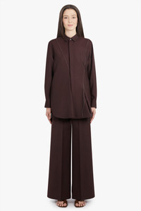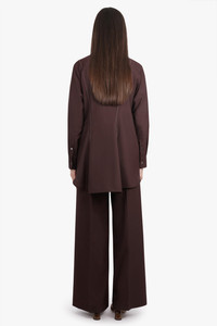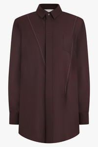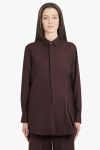 An elevated take on the classic shirt, this suiting long sleeve piece combines sharp tailoring with contemporary details. Crafted from a luxurious wool-polyester blend in warm brown tones, it features contrast white stitching that accentuates its panel construction. The natural flowing folds add softness and movement, while a functional chest pocket enhances its practical appeal. Designed with a structured yet relaxed fit, this shirt effortlessly blends refinement and modernity. - Face Side: 70% Polyester, 30% Wool - Back Side: 100% Polyester - Attached Parts: 70% Polyester, 30% Wool - Long sleeves with tailored panel detailing - Contrast white stitching for graphic definition - Functional chest pocket - Natural flowing folds for movement and ease - Warm brown tonal palette Pair with tailored trousers or denim from Sacai to elevate your everyday wardrobe with smart sophistication.