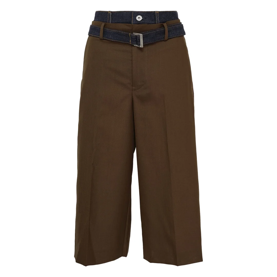 300051333BRN-01 / E626-08290/00/BROWNxINDIGO - Mixed fabrication - wool suiting and denim - Cropped wide-leg silhouette - Contrasting topstitching details - Denim waistband with button closure - Removable belt with buckle - Pressed creases on suiting panels - Relaxed fit through hips and thighs sacai Suiting x Denim Pants deliver innovative hybrid design combining formal suiting with casual denim construction. Crafted with brown wool suiting fabric layered over navy denim with contrasting topstitching and mixed fabrication throughout. The signature sacai deconstructed aesthetic creates a contemporary cropped silhouette that redefines modern tailoring.