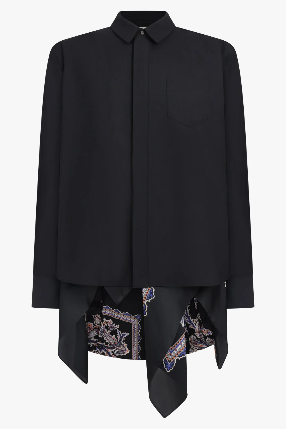 A refined study in contrast and construction, the Suiting x Paisley Print Drape Front Shirt by Sacai merges tailored precision with fluid, softly architectural movement. The piece begins as a structured long-sleeve button-up, its clean lines emphasised by a concealed button placket and crisp suiting fabrication. From one shoulder, a silky draped panel cascades beneath the overlay, introducing dimension and a sense of controlled fluidity. Rendered in Sacai’s signature paisley motif in deep, muted tones, the panel harmonises with the black suiting shell while adding visual richness and textural depth. Finished with buttoned cuffs, the silhouette balances polish with the brand’s unmistakable hybrid detailing. - Fabrication: Polyester 70%, wool 30%; Attached Parts: polyester 100%; Liner: cupro 100% - Structured long-sleeve button-up with a concealed front placket - Soft, silky drape panel extending from the shoulder for sculptural fluidity - Paisley print underlay in dark tones to complement the black suiting overlay - Buttoned cuffs for tailored refinement - Hybrid construction blending crisp suiting with expressive movement Style it with tailored trousers or an A-line skirt to emphasise the interplay between structure and softly draped detailing. Size and Fit Tiah: Model is 178cm/5’9” and is wearing a size JP1 Model Measurements: Bust: 86cm, Waist: 69cm, Hips 90.5cm Fits true to size