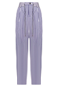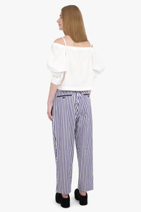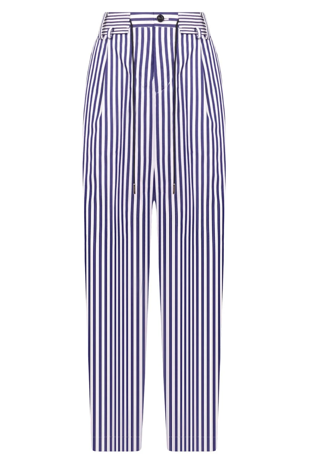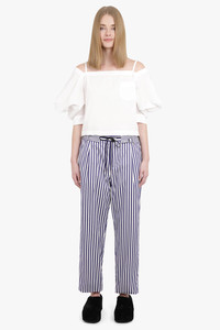 The Sacai x Thomas Mason Jogger Pant in Navy Stripe is a collaboration between the house and heritage fabric manufacturer, Thomas Mason. This style features a contrast waistband, side pockets, drawstring and zip fly with a tapered leg fit. Fabrication: 100% Cotton, Lining: 100% Cupro. Size and Fit Sophie: Model is 179cm/5’10” and is wearing a size JP1 Model Measurements: Bust: 76cm, Waist: 61cm, Hips 87.5cm Japanese sizing Fits true to size