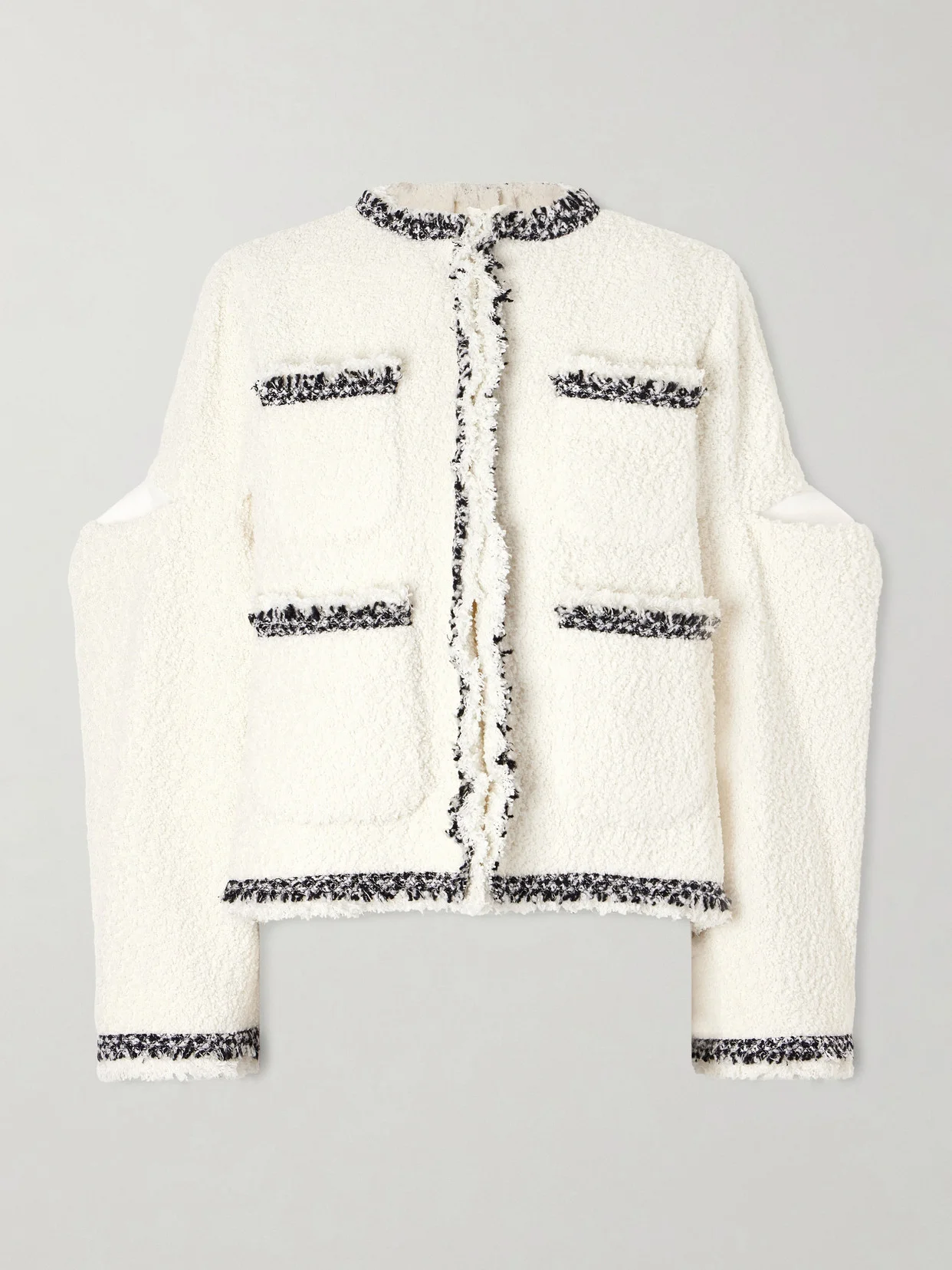 Sacai's jacket offers an exaggerated take on classic vintage suiting. Made from tactile tweed, it's fitted with an array of patch pockets and has voluminous sleeves and dropped shoulders. Note how the frayed edges and contrasting trims enhance the shape.