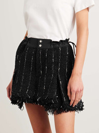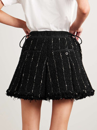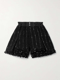 EDITORS'NOTES Sacai's shorts are part of a set with the coordinating jacket, but look just as chic styled with a simple blouse or T-shirt. They're tailored from tactile boucle embroidered with pinstripes and finished with frayed edges and a elasticated shell waistband. SIZE & FIT Model measurements: - Size 1 = XS, 2 = S, 3 = M, 4 = L - Fits true to size, take your normal size - Mid-rise, cut for a relaxed fit - Elasticated at the waist for a comfortable fit - Mid-weight, non-stretchy fabric - Model is 177cm/ 5'10" and is wearing the designer's size 2 - Bust: 79cm/ 31" - Waist: 61cm/ 24" - Hip: 85cm/ 33.5" DETAILS & CARE - Black and white boucle , black shell - Button and concealed zip fastening at front - 67% nylon, 33% cotton; trim: 60% cotton, 40% nylon; lining: 100% cupro