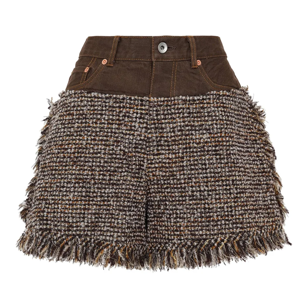 600069978BRN002 / 25-08049/00/601 - Brown denim waistband with button closure - Five-pocket denim styling - Multicolored tweed lower section - Raw fringe edges throughout - High-waisted fit - Hybrid construction design sacai Tweed Shorts deliver innovative hybrid design that merges classic denim with textural tweed fabrication. Crafted with brown denim waistband and multicolored tweed lower section featuring raw fringe edges throughout for dynamic movement and visual interest. The signature sacai aesthetic combines traditional tailoring with contemporary streetwear construction for distinctive layered styling.