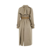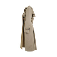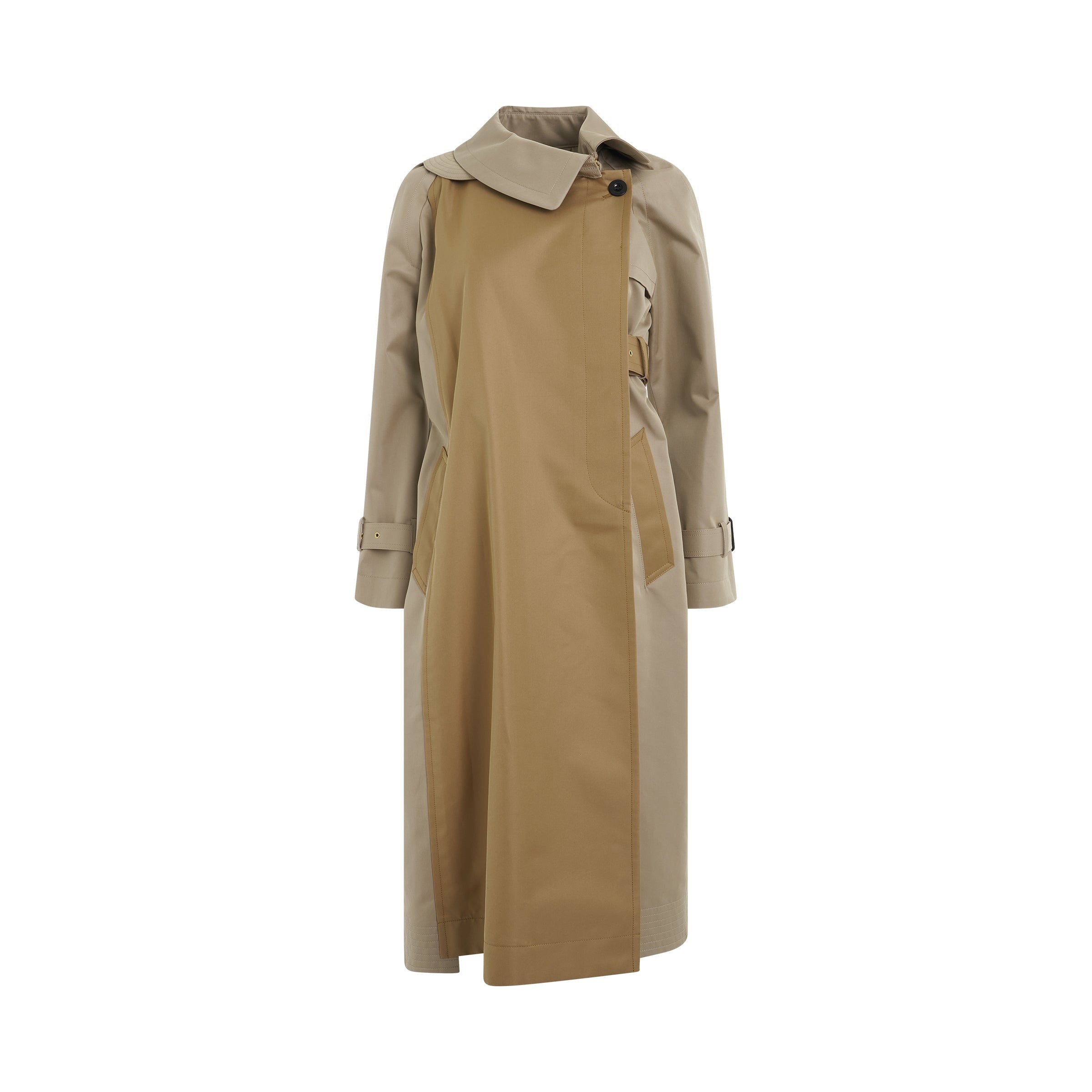 Long sleeves Sacai two-tone buttoned coat, a practical and stylish outerwear piece designed with meticulous attention to detail. This coat is crafted with functionality in mind, featuring a high asymmetric collar that adds a touch of uniqueness and fastens securely with a button. The coat stands out with its eye-catching light brown and beige colour-block finish, creating a visually striking contrast that exudes sophistication and modernity. The two-tone design adds depth and dimension to the coat, making it a standout piece in your wardrobe. To enhance both style and fit, the coat comes complete with a matching waist belt. The belt not only adds a stylish touch but also allows you to cinch the waist for a more tailored and flattering silhouette. • Composition: Outer: Cotton 65%, Polyester 35%. Lining: Cupro 100% • Long sleeves • High asymmetric collar • Two-tone colour block • Waist belt • Front button fastening • Cuffs fastening • Pleat detail at the back SKU: 2306437 651