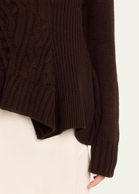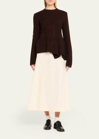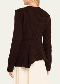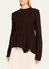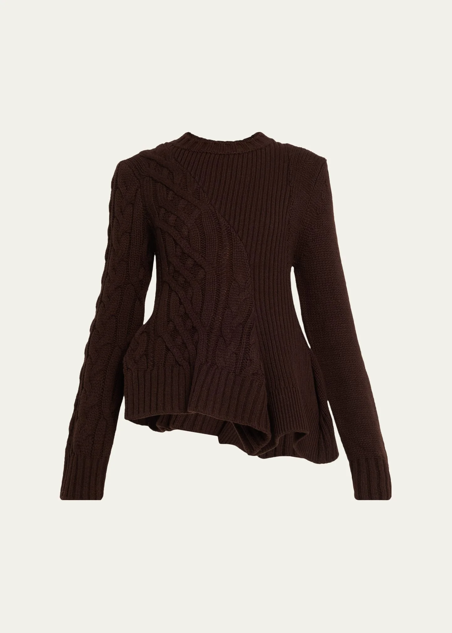 SACAI sweater reimagined with mixed knit asymmetric panels, which create a peplum flounce hem Crew neckline Long sleeves Relaxed fit Ribbed cuffs and hem Pullover style Wool Dry clean Imported Online Inquiries: BGS21_BAABB| Store Inquiries: #5067202