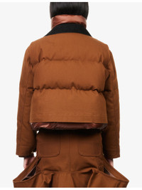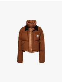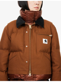 PRODUCT DETAILS - Sacai x Carhartt WIP cotton jacket - 100% cotton; lining 100% woven - Concealed zip fastening at front - Relaxed fit, corduroy collar, internal high-neck and zip panels, long sleeves, buttoned cuffs, internal elasticated cuffs, zip pocket and two jetted pockets at front, brand patch at front, all-over canvas texture, buttoned epaulette at sides, all-over quilted and padded, fully lined, drawstring hem - Hand wash cold - True to size - Size small: length 21in / 55cm - Model is 5ft 10in/1.78m and wears a size small - Midweight, non-stretch Ref: R04521712