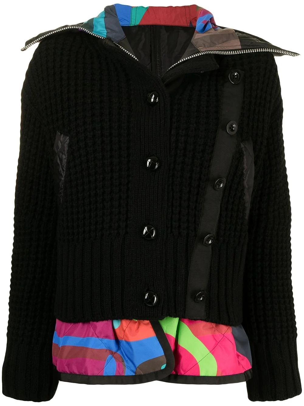 x KAWS deconstructed layered blouson Highlights - Black/multicolour - Wool-blend - Deconstructed design - Layered effect - Chunky knit - Split hood - Long sleeves - Ribbed cuffs - Front button fastening - Front zip fastening - Two side slit pockets - Quilted finish - Abstract pattern print - Ribbed hem Imported Composition Cupro 100% SIZE & FIT Model measurements Height 5 ft 9 in(1.76 m) Bust/Chest 32.28 in(82 cm) Hips 35.03 in(89 cm) Waist 23.62 in(60 cm) FittingInformation This piece fits true to size. We recommend you get your regular size Cut for a loose fit Made with a lightweight fabric Washing instructions Dry Clean Only