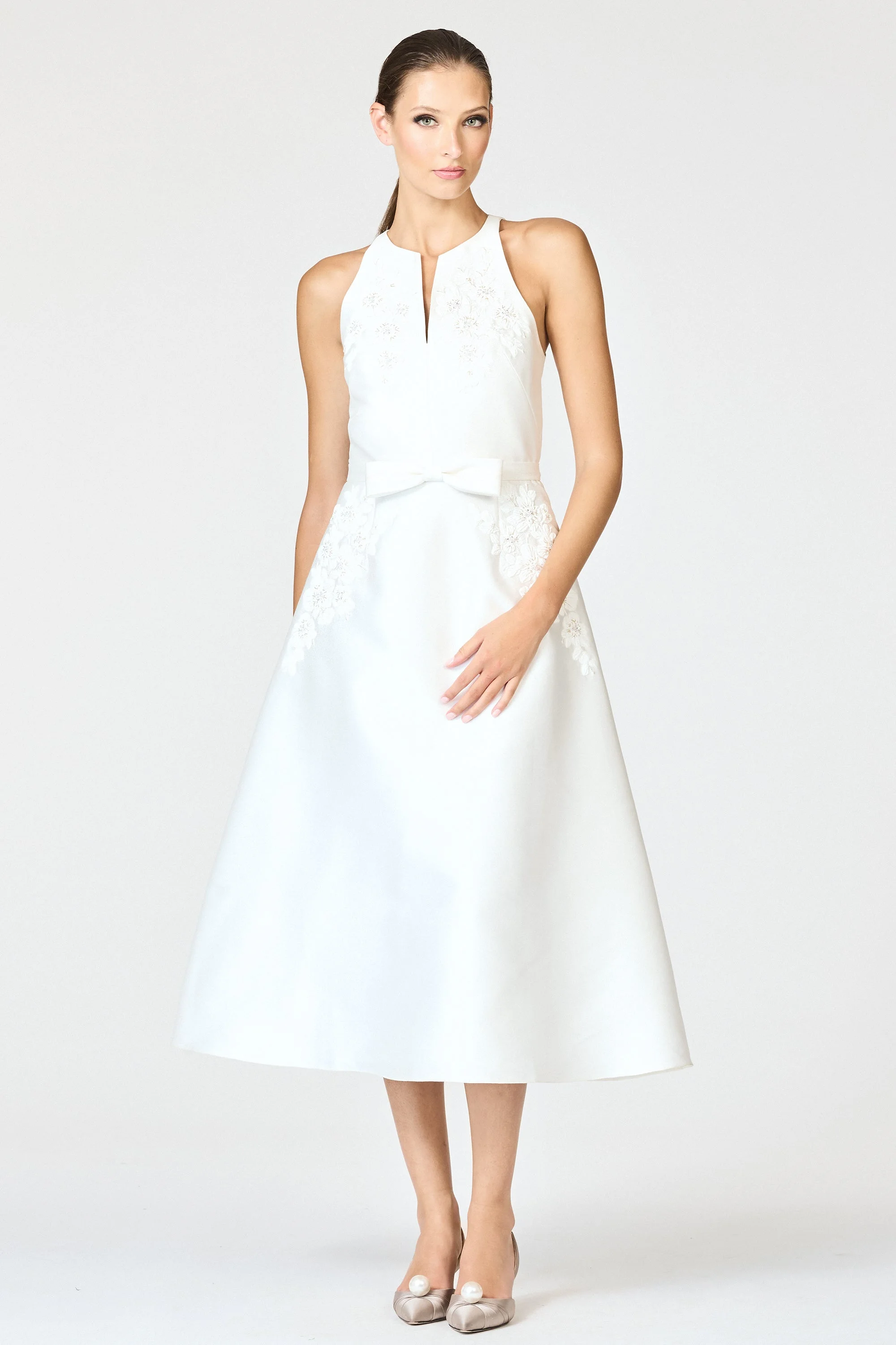 The Allison Dress in Ivory is a timeless expression of modern romance. Crafted in luminous satin-faille, it features a sleek halter-inspired neckline with a refined front slit that frames the collarbone beautifully. The bodice is delicately embroidered with tonal floral motifs accented by faceted crystal embellishments for subtle sparkle and artisanal detail. A fixed bow at the waist highlights the figure before flowing into a full, softly structured A-line skirt. Details: - Model is 5'10" Wearing A Size 2 - 47" Length on body - Back Zipper - Self belt - Full lining - Mikado - 85% Polyester, 15% Silk - Imported - Style # F251B14-103