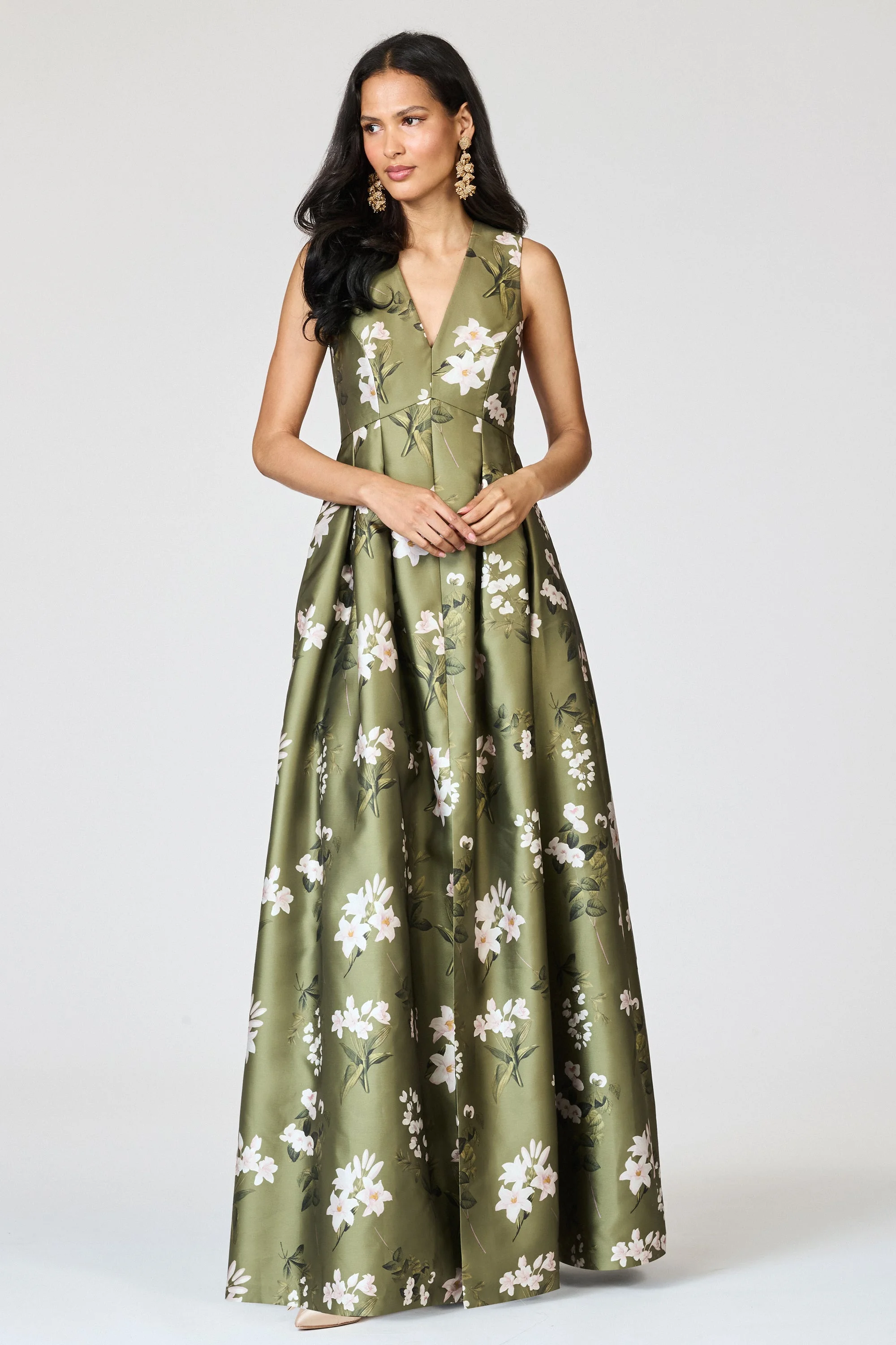The Brooke is our V-neck gown with box pleats, peaked waist seam, and side pockets. This dress is what we consider to be a classic, essential silhouette - a perfect canvas for our most breathtaking prints. As always, our prints are exclusive to Sachin&Babi and created by our design team, ensuring you will not see them anywhere other than in our Collection. Details: - This Is Intended To Be A Full-Length Gown - Model is 5'11" wearing size 2 - Length of Garment, 60 1/2" from top of shoulder to bottom hem, Plus size 62" - Back Zipper - Full Lining - Pockets - Front Slit - Printed Mikado - 100% Polyester - Imported - Style #F251G06-382