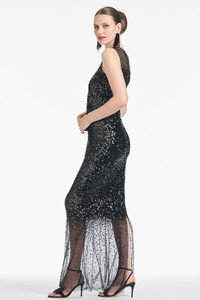 Adorned with black shimmering sequins, the Candice gown exudes elegance and sophistication. Its unique fade effect with hand-placed embellishment and tulle at both ends make her a true work of art. Showstopping, put simply. Details: - Model is 5'9" wearing size 2 - Full-Length, 60" from top of shoulder to bottom hem - Back Zipper & Hook and Eye Closure - Scatter Sequins & Tulle - 95% Polyester, 5% Spandex - Imported - Style #F242G14-001