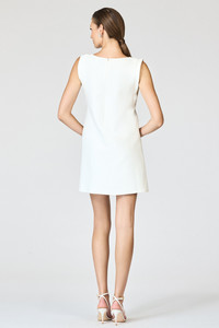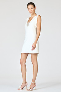The Cecily Dress in Ivory is a modern take on minimalist glamour with an artful touch of sparkle. This sleek sleeveless mini silhouette features clean, architectural lines that skim the body with effortless sophistication. The deep U-shaped neckline is inset with illusion mesh densely hand-embellished with faceted crystals, creating a dazzling focal point that catches the light with every movement. Understated yet striking, Cecily is designed for celebrations that demand contemporary elegance and refined shine. Details: - Model is 5'10" wearing size S - Full-Length, 34" from top of shoulder to bottom hem - Back Zipper - Full Lining - No Pockets - Stretch Crepe - 92% Polyester, 8% Spandex - Imported - Style # F251B19-103