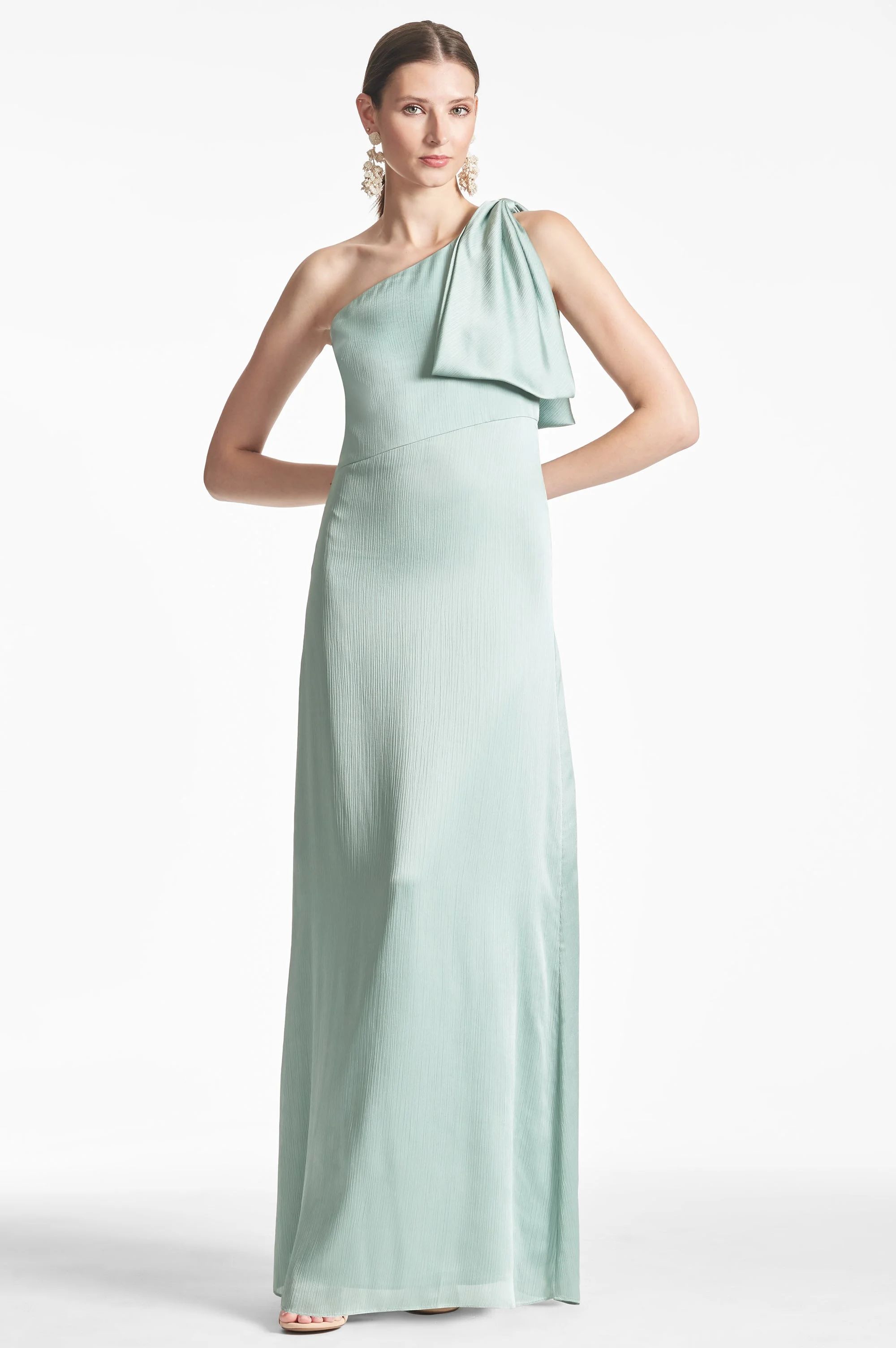 The Chelsea gown is an example of balance by design. A sleek sleeve of crinkle georgette is cut on the bias with an asymmetric seam at the waist, creating a column for curves. At the shoulder sits a hand-tucked, stitched-on collapsed bow. We design all of our Essential Social dresses with the intention that they can be enjoyed again and again. After all, a beautiful dress should be worn often and well. Details: - This Is Intended To Be A Full-Length Gown - Model is 5'10" Wearing A Size 2 - Plus-Sized Model is 5'10" wearing size 16W - Full-Length, 60" from top of shoulder to bottom hem - Side Zipper - Full Lining - No Pockets - Crinkle Georgette - 100% Polyester - Imported - Style #F231B42-300