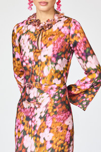 Daria is a gown made to captivate. Confident, graceful, and full of color, the silhouette features a sharp collar, fitted bodice, and flared sleeves that add a playful sense of movement. The kaleidoscope floral print bursts across the fabric in vibrant pinks, purples, and golds, making Daria a true standout wherever she goes. As always, our prints are exclusive to Sachin&Babi and created by our design team, ensuring you will not see them anywhere other than in our Collection. Details: - This Is Intended To Be A Full Length Gown - Model is 5'11" wearing a size 2 - Length of Garment, 61 1/2" from top of shoulder to bottom hem - Half Lining - Back Zipper - No Pockets - Printed Silk - Viscose Twill - 55% Silk, 45% Viscose - Imported - Style #R261D03-873