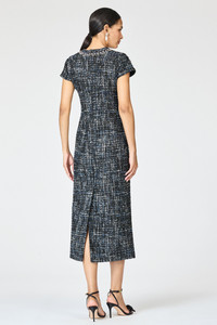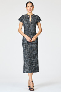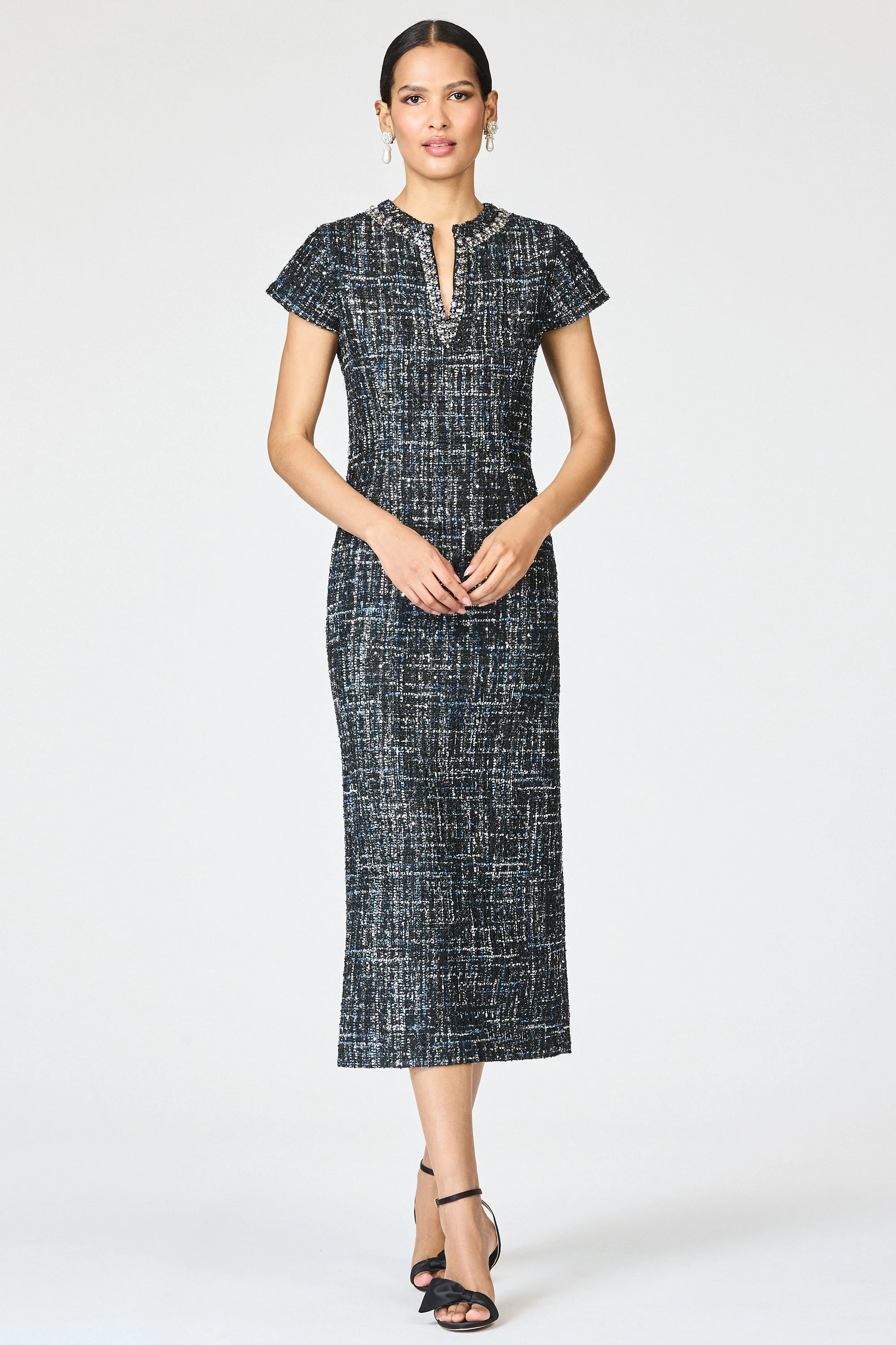 The Liz Dress brings structure and sparkle in equal measure. Crafted in Obsidian Frost tweed, this sleek, tailored silhouette is softly shaped through the body and finished with a subtle slit at the neckline. The collar is gently embellished for a hint of shine—just enough to elevate, never overpower. A polished choice for both daytime occasions and dressed-up evenings. Details: - Model is 5'11" wearing size 2 - Length of garment, 48" from top of shoulder to bottom hem - Full lining - Back zipper - Back vent - No Pockets - Tweed - 100% Polyester - Imported - Style # R261D07-001