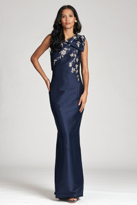 Meet Olivia, a modified take on our iconic Bonnie. Here in Night Sky with floral embellishment throughout the bodice, artfully embroidered by our 3rd generation artisans at our family owned atelier in Mumbai. This one-shoulder silhouette has a uniquely imagined bow that is hand applied and embroidered. This column gown is featured in vertical stretch Mikado, a fabric that is known to hold its shape. The vertical stretch gives the fabric its bounce and maintains the design's silhouette, it does not offer horizontal give across the body. Details: - This Is Intended To Be A Full-Length Gown - Model is 5'10" wearing size 2 - Length of Garment, 61" from top of shoulder to bottom hem - Side Zipper - Full-lining - No Pockets - Solid Stretch Mikado - 97% Polyester - 3% Spandex - Imported - Style #S251G32-415