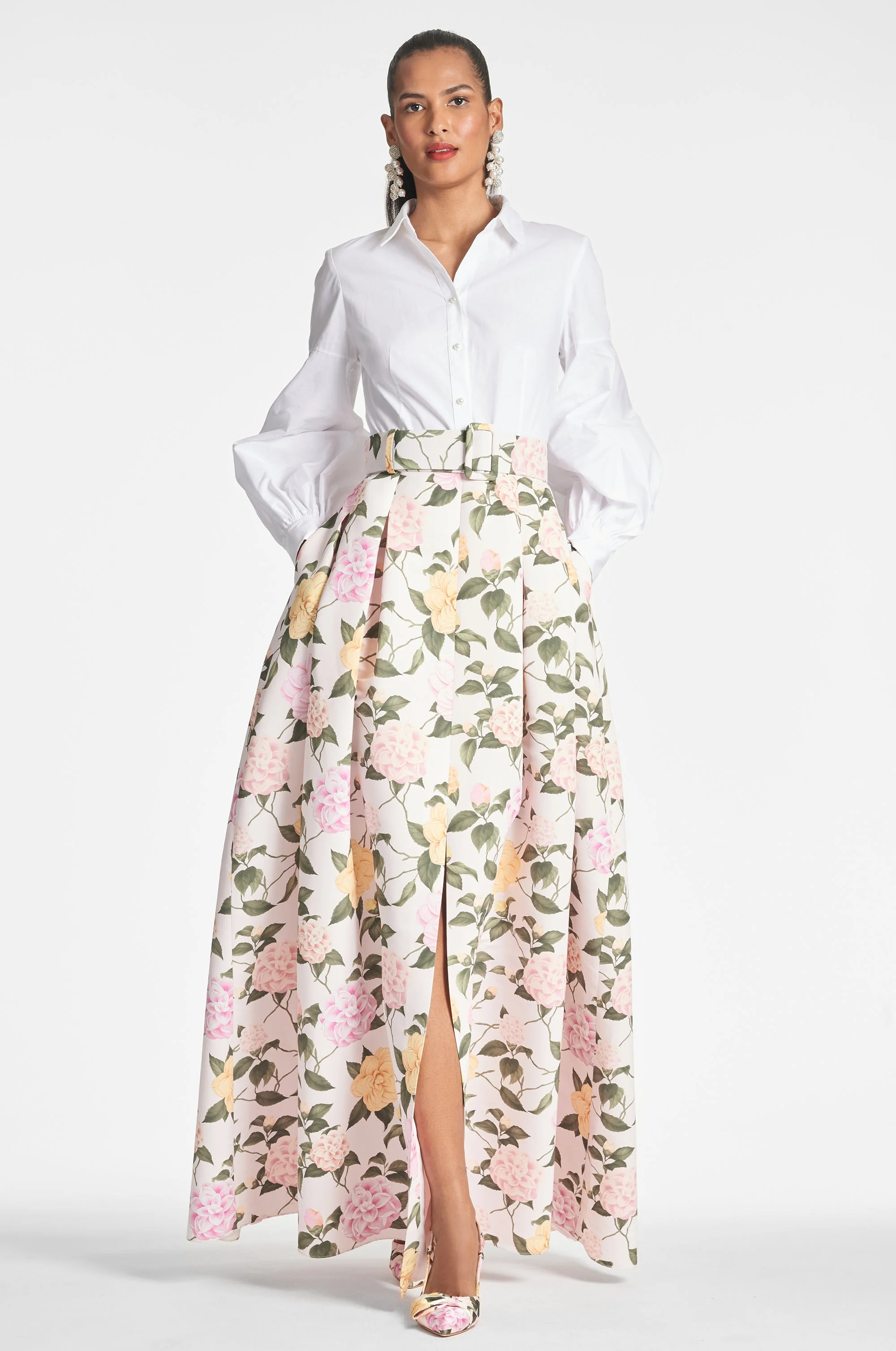 Florence is classic. The Indian cotton bodice features a slight cut-away at collared neck, round pearl buttons down the center front, and lantern sleeve with invisible stitching to create that dramatic shape. The bottom of this gown is our Pink Lemonade Bouquet print, the colors inspired spring and summer when its in full bloom. The two pieces are met in the middle with a printed belt for a flattering, waist-cinching look. As always, our prints are exclusive to Sachin&Babi and created by our design team, ensuring you will not see them anywhere other than in our Collection. Details: - Model is 5'11" wearing size 2 - Full-Length, 60" from top of shoulder to bottom hem - Front Button Closure - Indian Cotton - Printed Poly Faille - 100% Polyester - Imported - Style #S243G25-290