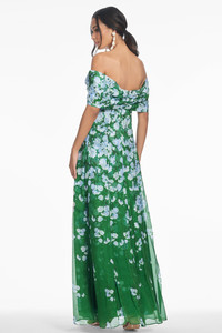The Kennedy Gown is a study in modern romance. Designed with a graceful off-the-shoulder neckline and a softly sculpted silhouette, this gown moves with quiet drama and undeniable elegance. The delicately faded floral motif adds depth and artistry, while the airy, fluid fabric ensures every step feels effortless. Perfect for any occasion that calls for refined glamour. As always, our prints are exclusive to Sachin&Babi and created by our design team, ensuring you will not see them anywhere other than in our Collection. Details: - This Is Intended To Be A Full-Length Gown - Model is 5'11" wearing size 2 - Length of Garment, 61 1/2" from top of shoulder to bottom hem - Back Zipper - Full Lining - No Pockets - Printed Silk Viscose - 74% Viscose, 26% Silk - Imported - Style #S253G41-358