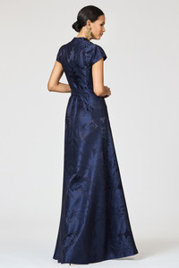 A modern silhouette grounded in timeless elegance. The Mara Gown is tailored from jacquard damask in an inky denim hue, featuring a notched neckline, cap sleeves, and a cinched waist with a structured belt. A full skirt with front slit detailing adds movement and ease. Sleek yet romantic, this gown makes a powerful statement with minimal effort. As always, our prints are exclusive to Sachin&Babi and created by our design team, ensuring you will not see them anywhere other than in our Collection. Details: - This Is Intended To Be A Full-Length Gown - Model is 5'11" wearing a size 2 - Self-tie belt - Damask - 55% Silk, 45% Polyester - Imported - Style # R261G08-411