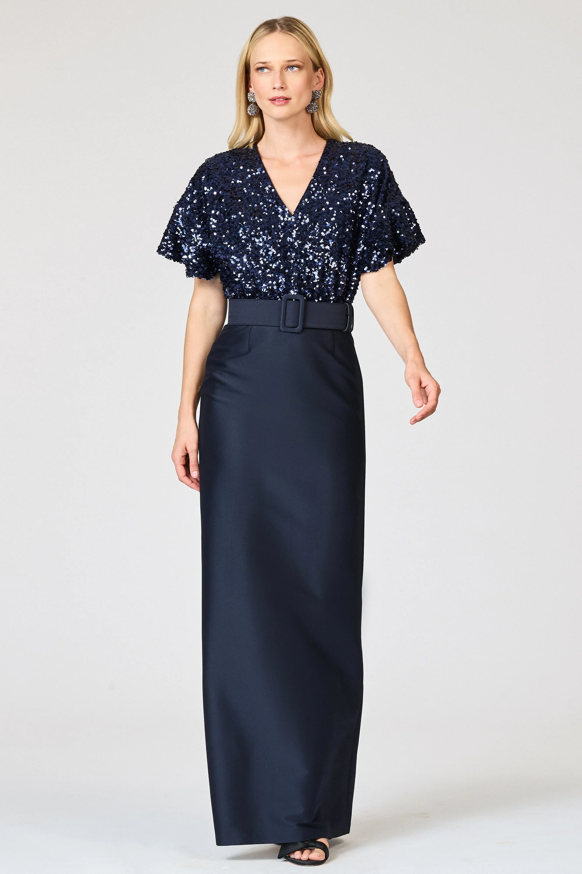 The Marlene Gown is designed to dazzle. This striking silhouette features a wide, deep V neckline framed by a fluttering sleeve, fully embellished in midnight scatter sequins for an eye-catching shimmer. A smooth stretch mikado skirt skims the body and falls straight to the floor, cinched at the waist with a clean belt. Equal parts elegance and ease, this gown balances sparkle with structure. Details: - This Is Intended To Be A Full-Length Gown - Model is 5'10" wearing a size 2 - Full-Length, 61" from top of shoulder to bottom hem - Plus size 63" - Back Zipper - Full Lining - No Pockets - Scatter Sequins - 95% Polyester, 5% Spandex - Solid Stretch Mikado - 97% Polyester, 3% Spandex - Imported - Style # R262G39-410