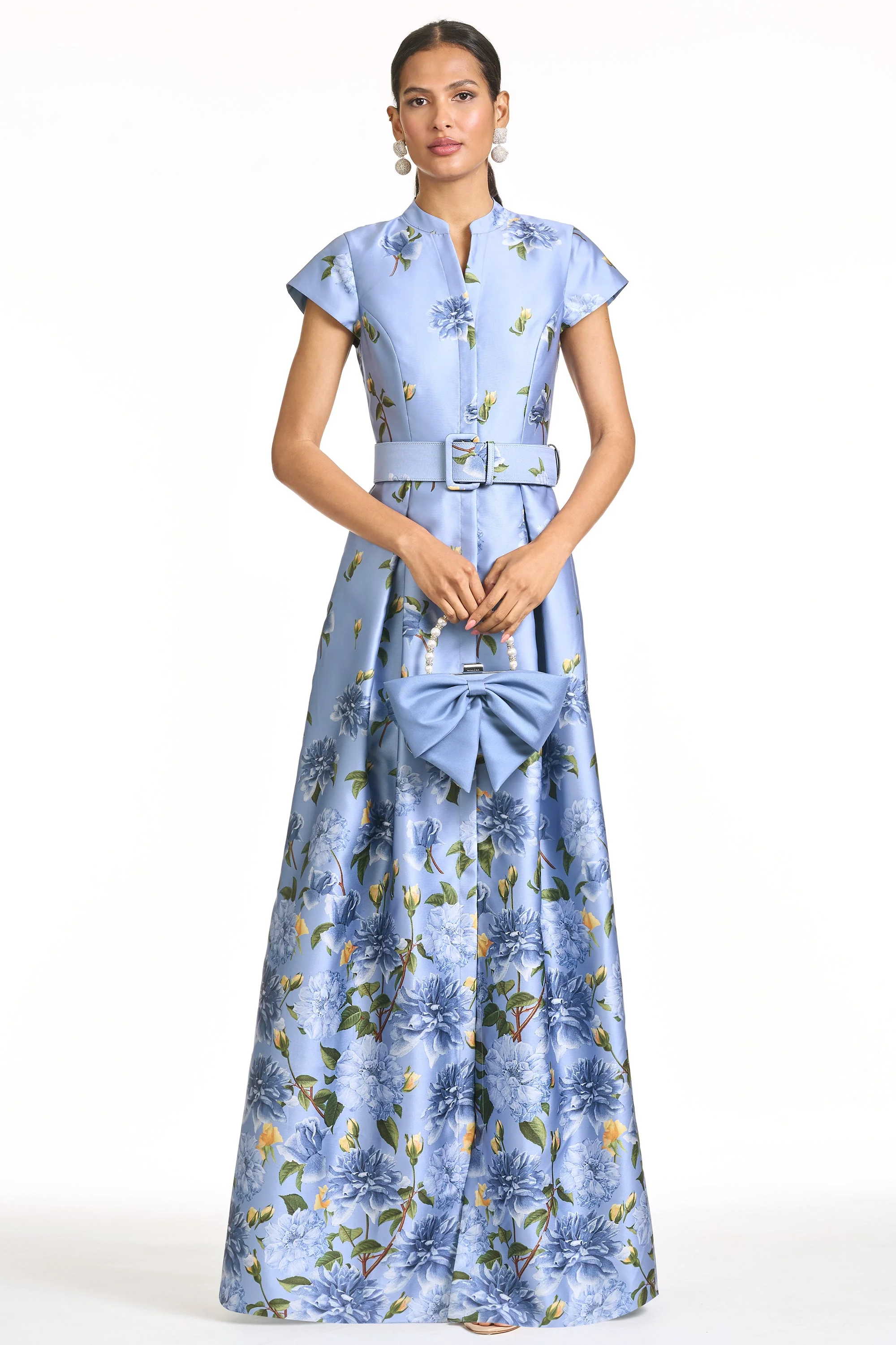 Make no mistake, the Marta Gown is no wallflower. She is the epitome of timeless, elevated personal style and quiet luxury. The fit and print are everything. The floor-length silhouette is partially inspired by the impeccable tailoring of a "shirt style" fit. This incredibly flattering body finds its way into our Iced Twilight Peony Degrade print. A banded collar is tastefully cut away to meet concealed front buttons. Our Mikado fabric with the mono-color florals makes this dress a classic and a statement all at once. As always, our prints are exclusive to Sachin&Babi and created by our design team, ensuring you will not see them anywhere other than in our Collection. - This Is Intended To Be A Full-Length Gown - Model is 5'11" wearing a size 2 - Length of Garment, 60" from top of shoulder to bottom hem - Pockets - Separate Belt - Full Lining - Printed Mikado - 100% Polyester - Imported - Style # S261G08-495