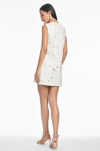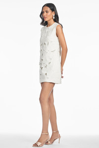 Meet the Mitzi Dress, where modern elegance meets playful charm. This ivory mini shift stuns with all-over intricate laser-cut florals that add texture and dimension to its sleek silhouette. Effortless yet eye-catching, she's the perfect piece for everything from bridal events to garden parties to chic city soirees. Dress it up, keep it simple—either way, Mitzi makes a statement. Details: - Model is 5'11" wearing size S - Full-Length, 34" from top of shoulder to bottom hem - Back Zipper - Full Lining - No Pockets - Stretch Crepe - 92% Polyester, 8% Spandex - Imported - Style # S251B09-103