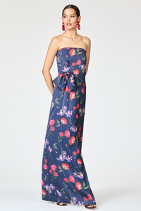 The Monroe Dress is an effortless study in elegance and vibrancy. Crafted in a smooth satin crepe, this strapless column silhouette is reimagined in a painterly Midnight Jardin floral print. A delicately sculpted bow at the waist highlights the figure while adding feminine structure. The side slit offers graceful movement with each step, blending modern ease with statement appeal. As always, our prints are exclusive to Sachin&Babi and created by our design team, ensuring you will not see them anywhere other than in our Collection. Details: - This Is Intended To Be A Full-Length Gown - Model is 5'11" wearing size 2 - Back Zipper - Full Lining - No Pockets - Printed Satin Crepe - 100% Polyester - Imported - Style # R262G22-418