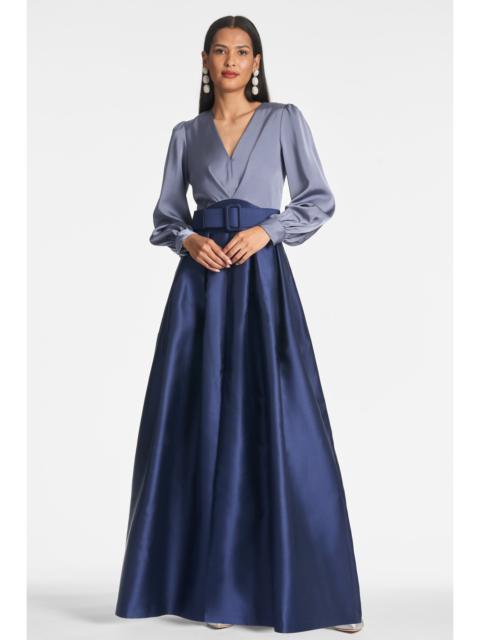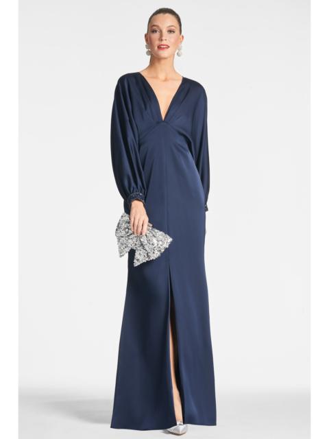 Maia is nothing less than chic, her relaxed silky silhouette definitely gives "Old Hollywood" glamour. Her deep V-neck still has enough coverage to feel appropriate without sacrificing the sultry effect of the gown. What we love is the embellishment at the cuffs, just a little something to set her apart from the crowd. Details: - Model is 5'10.5" wearing a size 2 - Full-Length, 60" from top of shoulder to bottom hem - Back Zipper - Satin Crepe - 100% Polyester - Imported - Style #R241G24-410