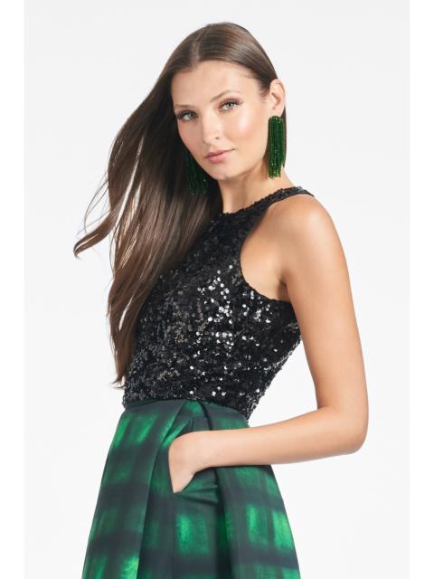 Lexie is an ordinary racer-back tank silhouette made extraordinary with its allover black sequins. We love the simplicity of this style; it is the perfect canvas while still adding its own edge to your look. In its clean lines and mono-embellishment lies an undeniable sophistication. Details: - Model is 5'10" wearing a size S - Full-Length, 17" from top of shoulder to bottom hem - Scatter Sequins - 95% Polyester - 5% Spandex - Imported - Style #F241T01-001
