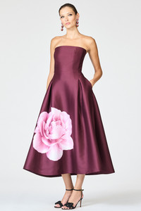 Simply put, Shay is something special. This strapless, tea-length stunner features a fitted bodice that perfectly cascades into an A-line skirt. There you'll find our Bordeaux Esperance print, amplifying the already elegant silhouette into a true work of art. As always, our prints are exclusive to Sachin&Babi and created by our design team, ensuring you will not see them anywhere other than in our Collection. Details: - The model is 5'10" wearing size 2. - Full length, 50" length from shoulder to bottom hem - Back Zipper - Full Lining - Pockets - Printed Stretch Mikado - 97% Polyester 3% Spandex - Imported - Style # F252D07-603