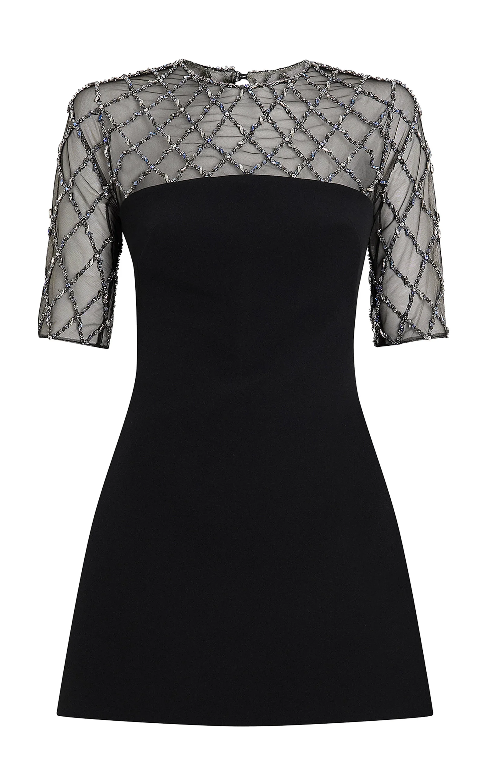 PRODUCT DETAILS - As featured in the Fall '22 lookbook - Tailored fit, crew neck, embroidered mesh short sleeves, mini hem, unlined - Concealed zip fastening along back - This style fits true to size, we suggest taking your normal size - Composition: 92 % polyester , 8 % elastane - Dry clean only - Imported