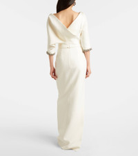 The Amaris bridal gown is shaped with a belted waist, thigh-high side-slit, column skirt, embellished 3/4-length sleeves, and a draped back. This piece is made from Safiyaa's signature heavy crepe – a fabric that is favored for its graceful draping qualities. Product Details - Material: 100% polyamide - Care instructions: dry clean - Made in Lithuania - Designer color name: Ivory With Gunmetal - Item color: white - Material II: 100% polyester - Material III: 96% polyester, 4% elastane - Lining: 97% polyester, 3% elastane - Trim: 60% plastic, 20% polyester, 20% glass - Hardware color: silver - Detachable belt - Closure: concealed zipped back - Long vent - Item number: P01078681 Size & Fit - True to size - Low back - Fitted - Non-stretchy fabric - The model seen in the picture is 178cm-5'10" and wearing a size FR 36