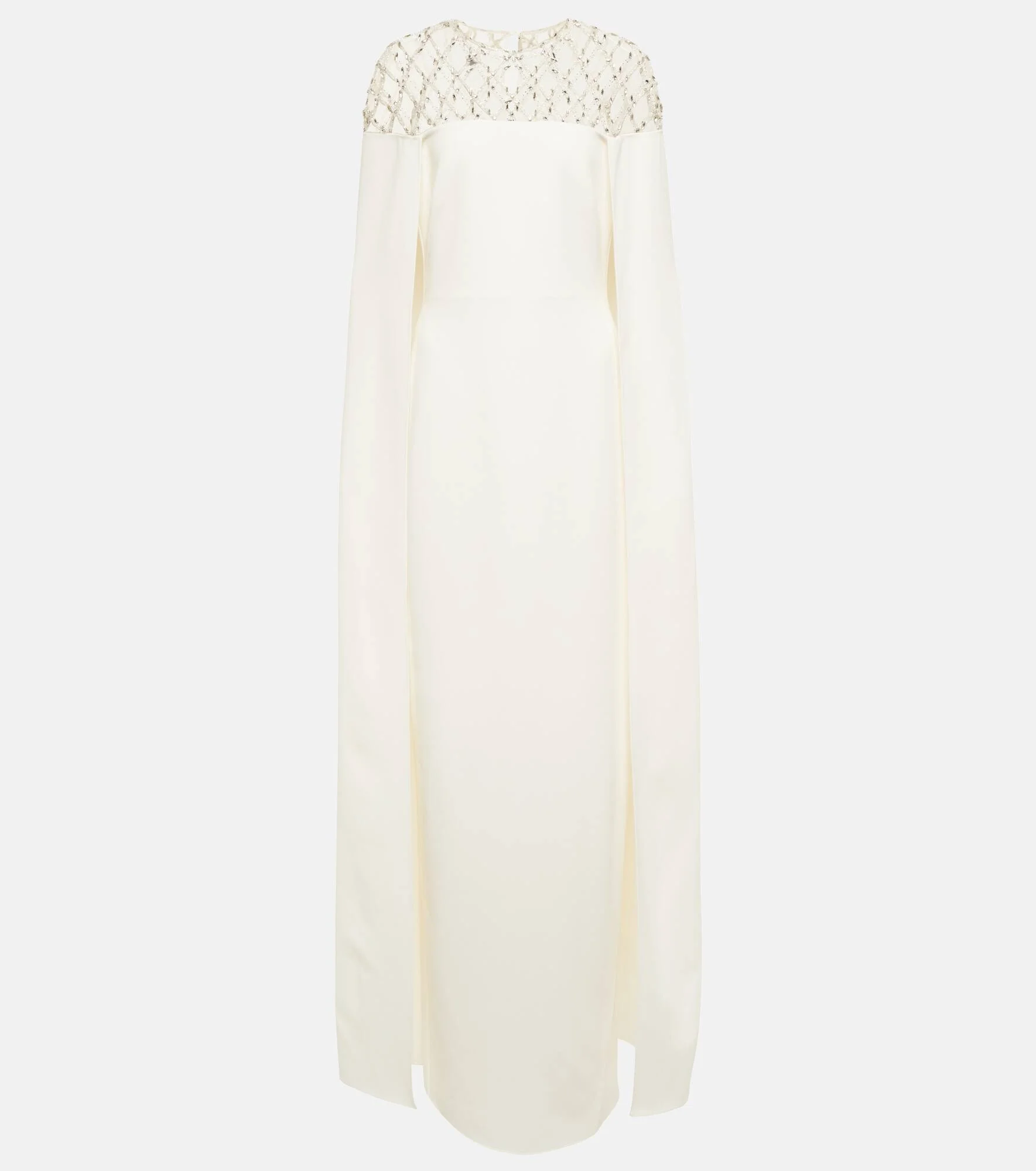 Sheer and shimmering, this floor-length cape gown from Safiyaa is made for a night to remember. Balancing the floor-length cape design, the crêpe body meets the crystal-embellished yoke to form a streamlined silhouette. Product Details - Trim: 100% acrylic - Material: 8% elastane, 92% polyester - Material II: 100% polyester - Designer color name: Ivory And Ivory With Crystal - Closure: button fastening, zipper, hook fastening - Made in Turkey - Care instructions: spot clean - Details: 20% brass, 80% crystals - Item number: P00685504 Size & Fit - True to size - Fitted - Loose outer layer - Mid-weight material - slit length 56cm-22" - The model seen in the picture is 178cm-5'10" and wearing a size FR 36